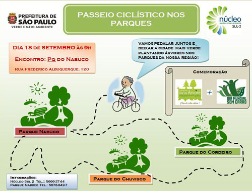 Nesse domingo, às 9h da manhã, acontece o 1º Passeio Ciclístico nos Parques de São Paulo. Será um passeio levem em terreno plano, para toda a família poderá participar. O percurso é simples e vai ligar três parques municipais: Nabuco, Chuvisco e Cordeiro, na zona sul de São Paulo.