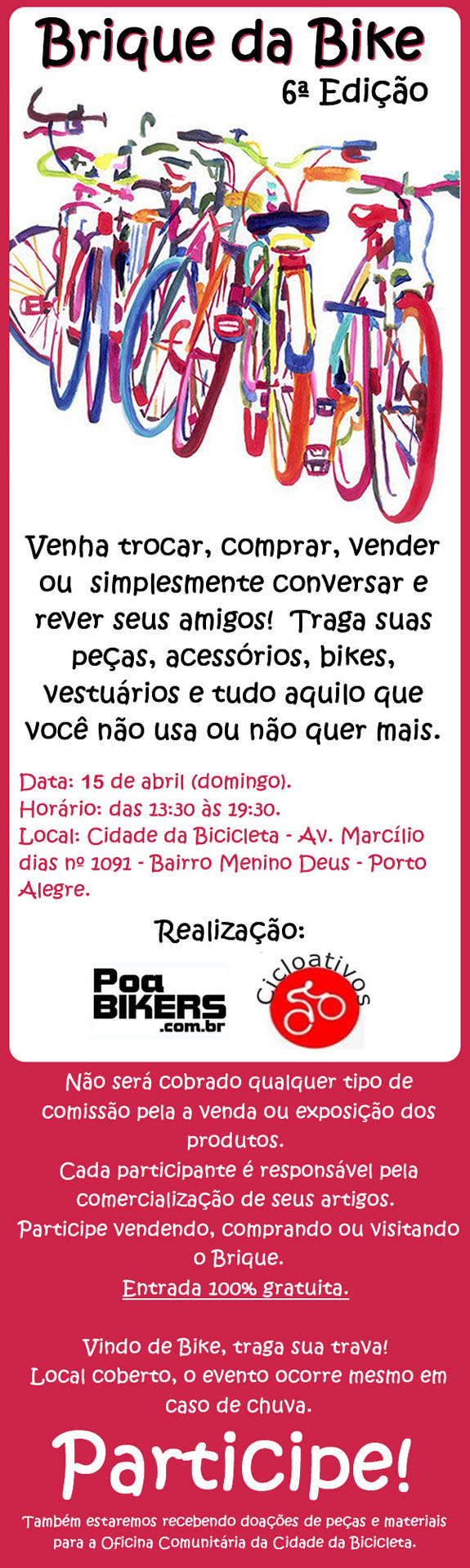 Está em Porto Alegre e não sabe pedalar? Neste domingo, 15 de abril, a Cidade das Bicicletas vai receber a Escola da Bici, a partir das 15h. Além da Escola da Bici, haverá também o Brique da Bici, das 14h às 19h, um espaço para conversas, trocas, vendas de peças e etc.