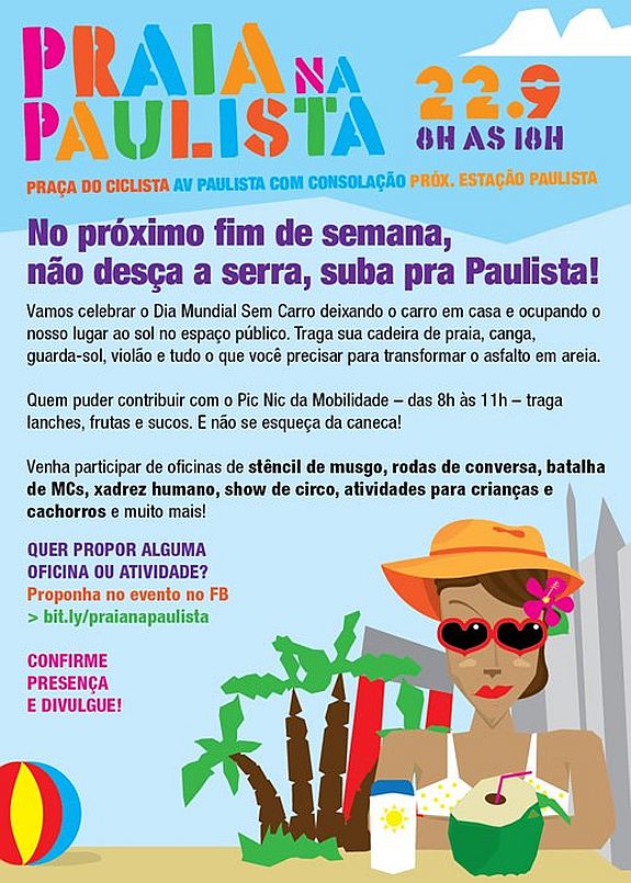 - Dia Mundial Sem Carro! Deixe seu carro na garagem e use um meio de transporte alternativo para se locomover no sábado! Em São Paulo teremos a Praia na Paulista; veja mais informações aqui.