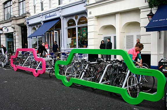 A empresa britânica Cyclehoop Ltd é especializada em transformar espaços inusitados em estacionamentos de bicicletas. Um de seus produtos é uma estrutura metálica na forma de um carro. Essa estrutura é colocada em uma vaga de estacionamento na rua, e pode abrigar com segurança 10 bicicletas!