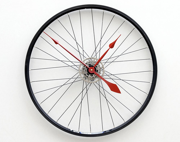 Quem, assim como nós, ama bicicleta, sempre tenta encontrar alguma peça, pôster, quadro ou qualquer outro objeto de decoração que lembre a bicicleta no conforto do lar. Uma boa ideia é o relógio de parede abaixo, que usa uma roda reciclada de bicicleta como base.