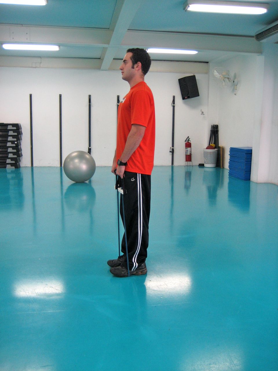 vista frontal. Note o detalhe do elástico simples. Pode-se diminuir o elástico original, que é duplo, visando obter uma tensão menor no exercício. Observe também o apoio do elástico realizado pelos dois pés.