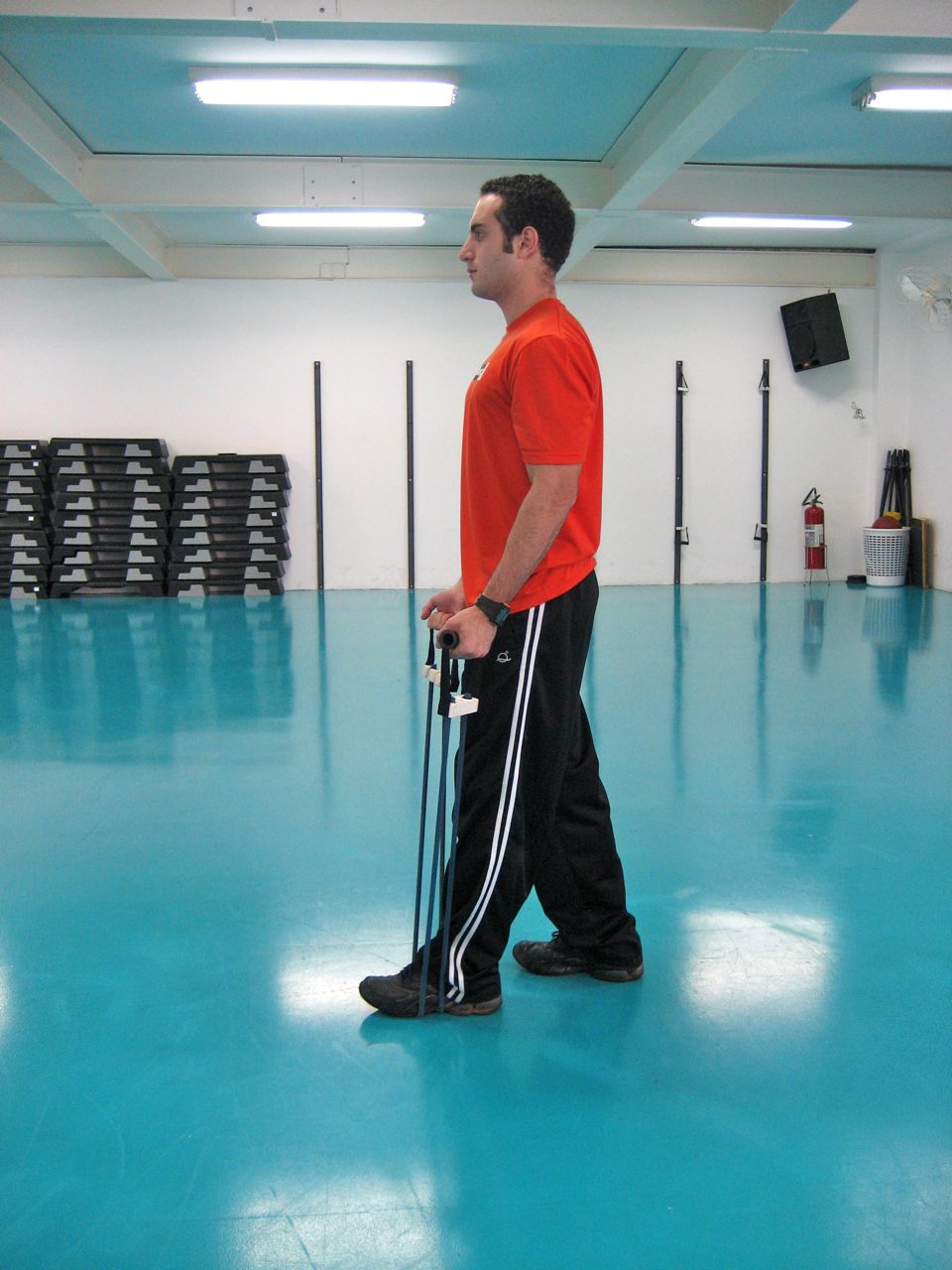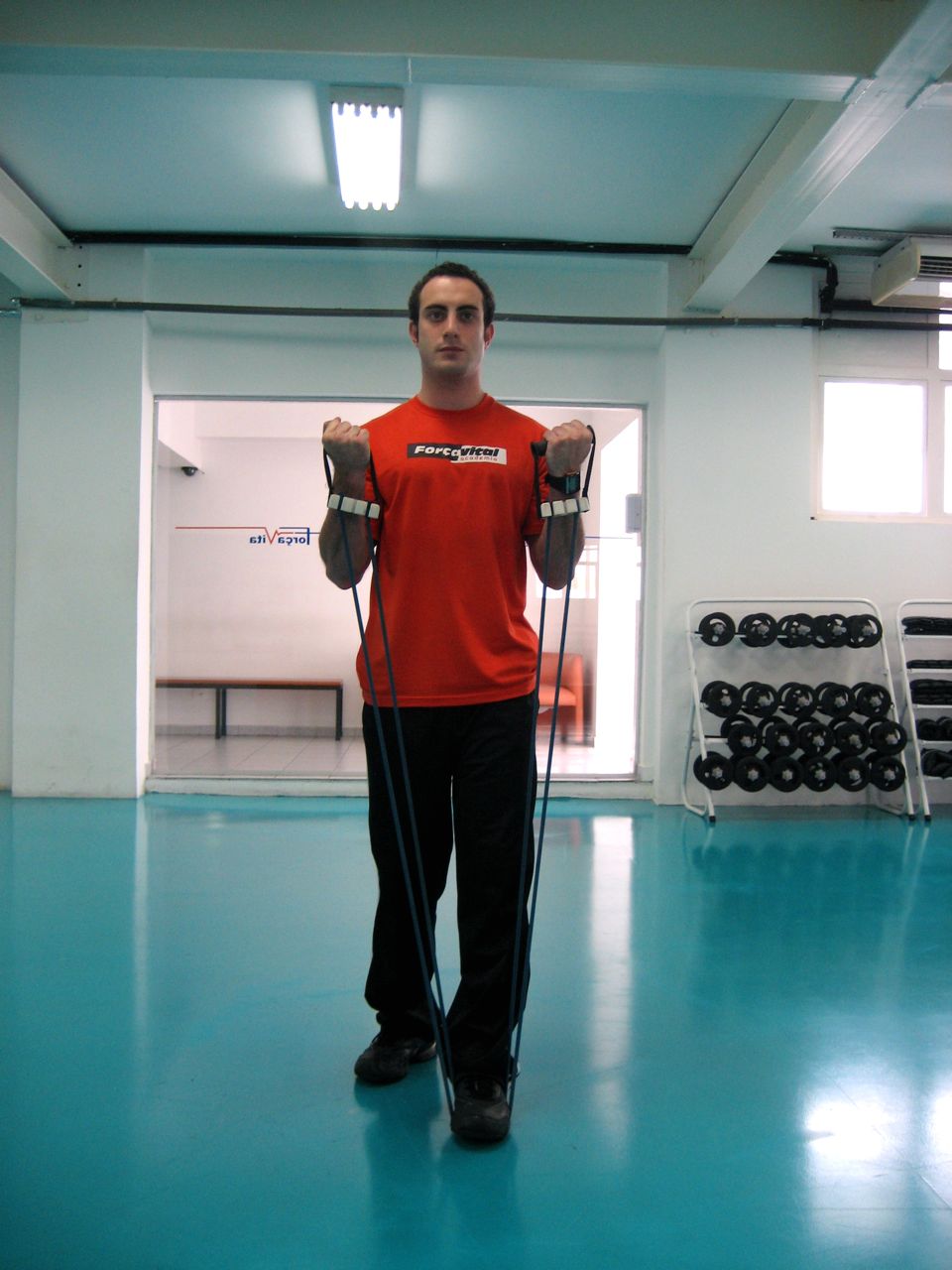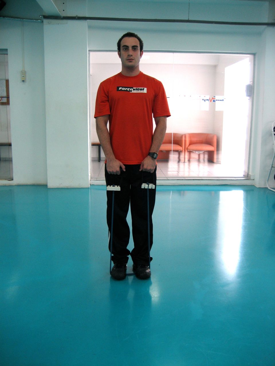 vista frontal. Note o detalhe do elástico simples. Pode-se diminuir o elástico original, que é duplo, visando obter uma tensão menor no exercício. Observe também o apoio do elástico realizado pelos dois pés.