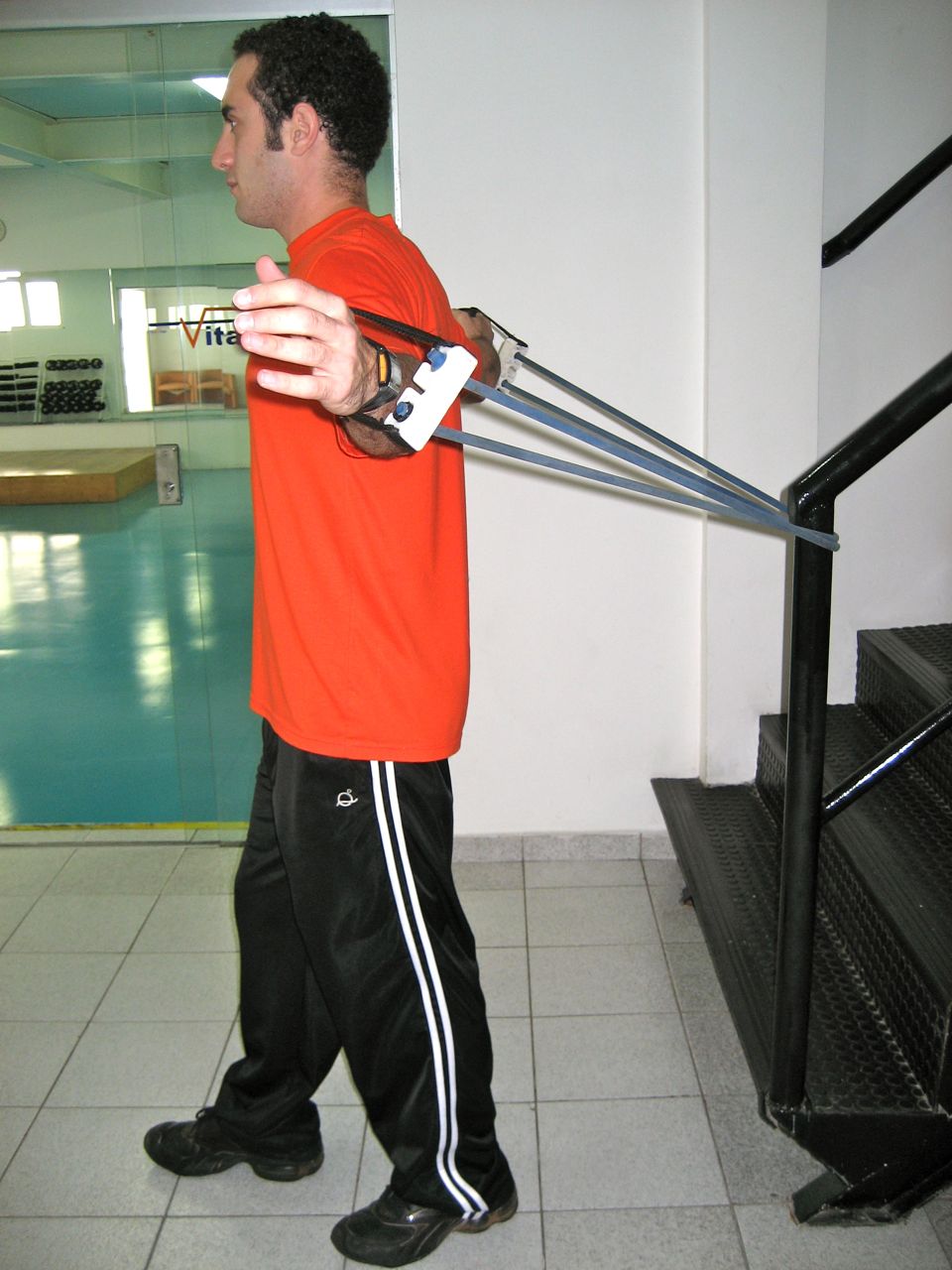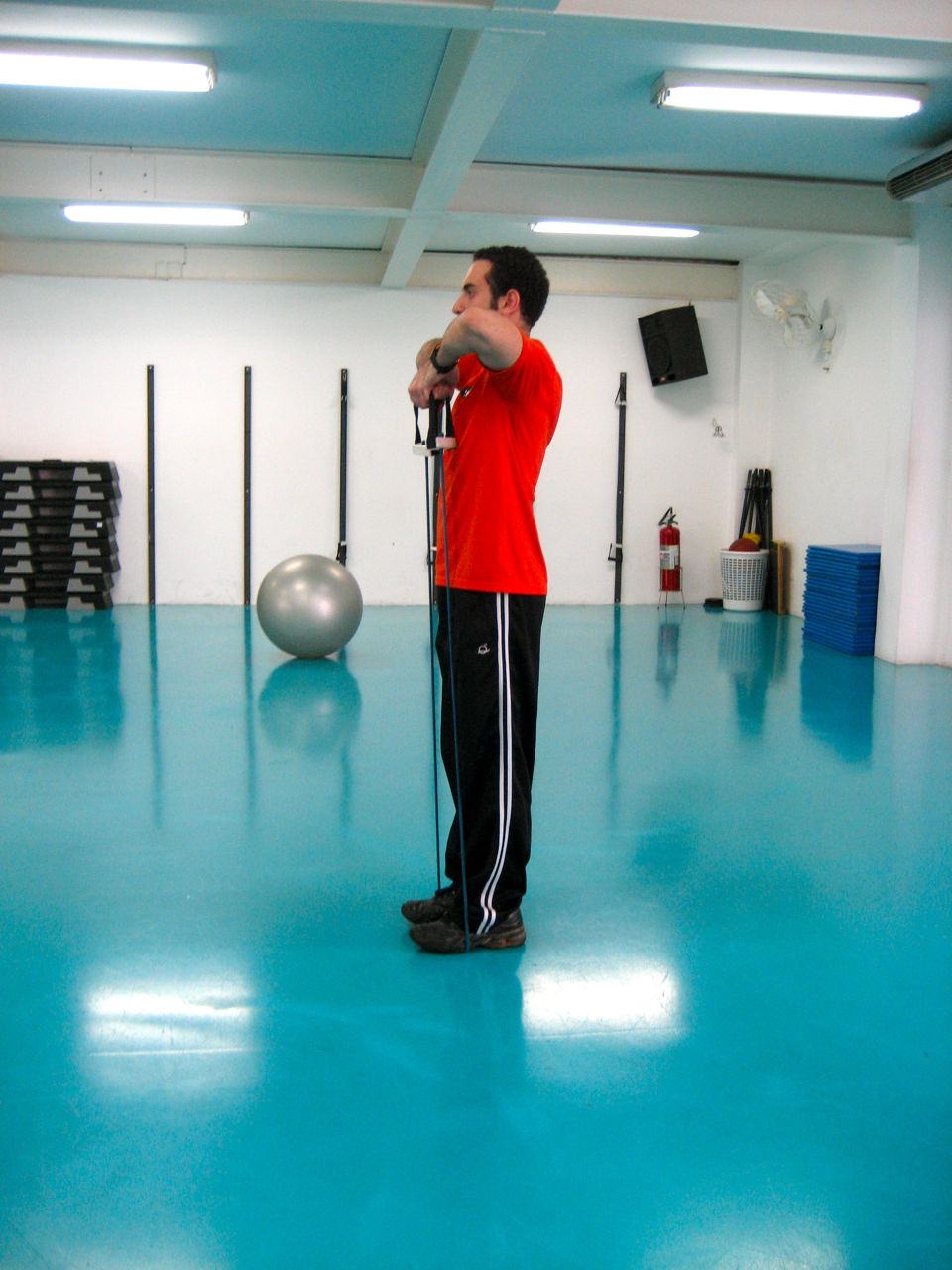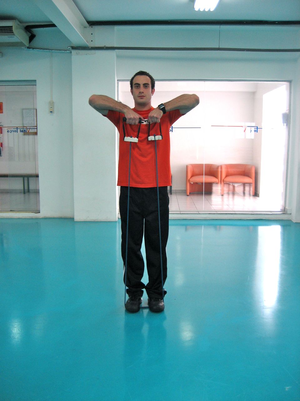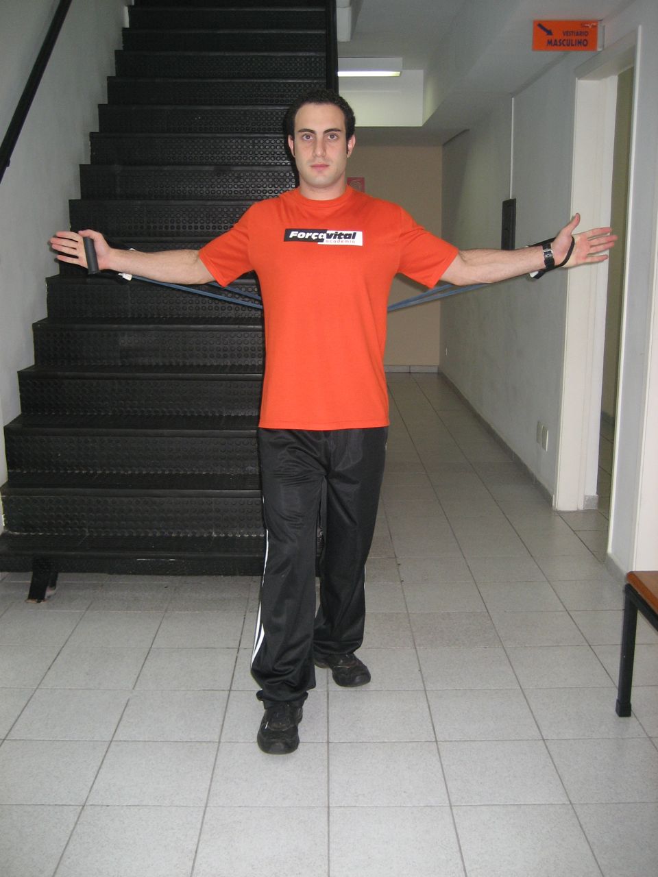 vista frontal. Note o detalhe do elástico simples. Pode-se diminuir o elástico original, que é duplo, visando obter uma tensão menor no exercício. Observe também o apoio do elástico realizado pelos dois pés.